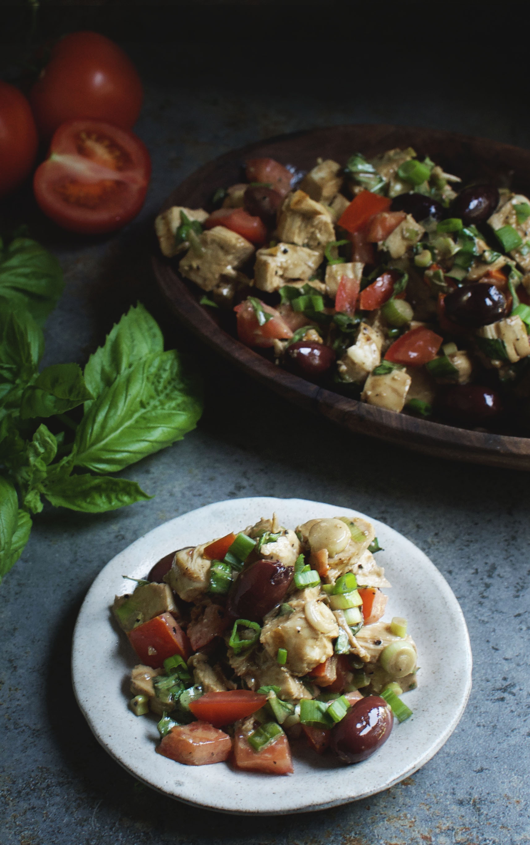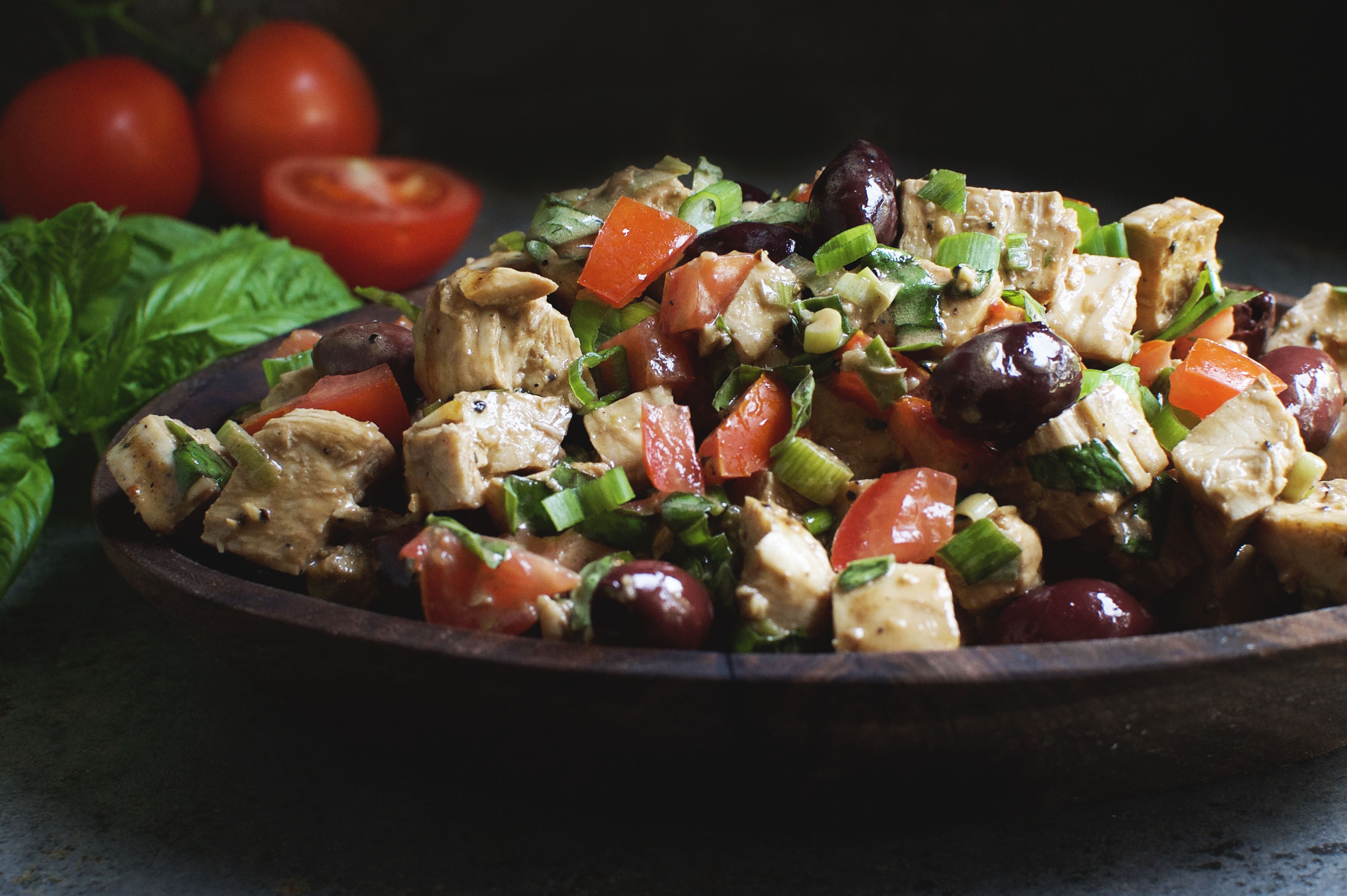 This summer, I have been trying to update some of our earlier recipes and take photos in the same style that we have developed. Our Mediterranean Chicken Salad recipe was one of the top on our list. As I started working through the recipe, however, I realized that the recipe wasn’t as low in carbs as I would like it to be. The old recipe contains sun-dried tomatoes, which I love, but are a little too high in carbs due to the concentrated sugars. I decided to use fresh tomatoes instead.