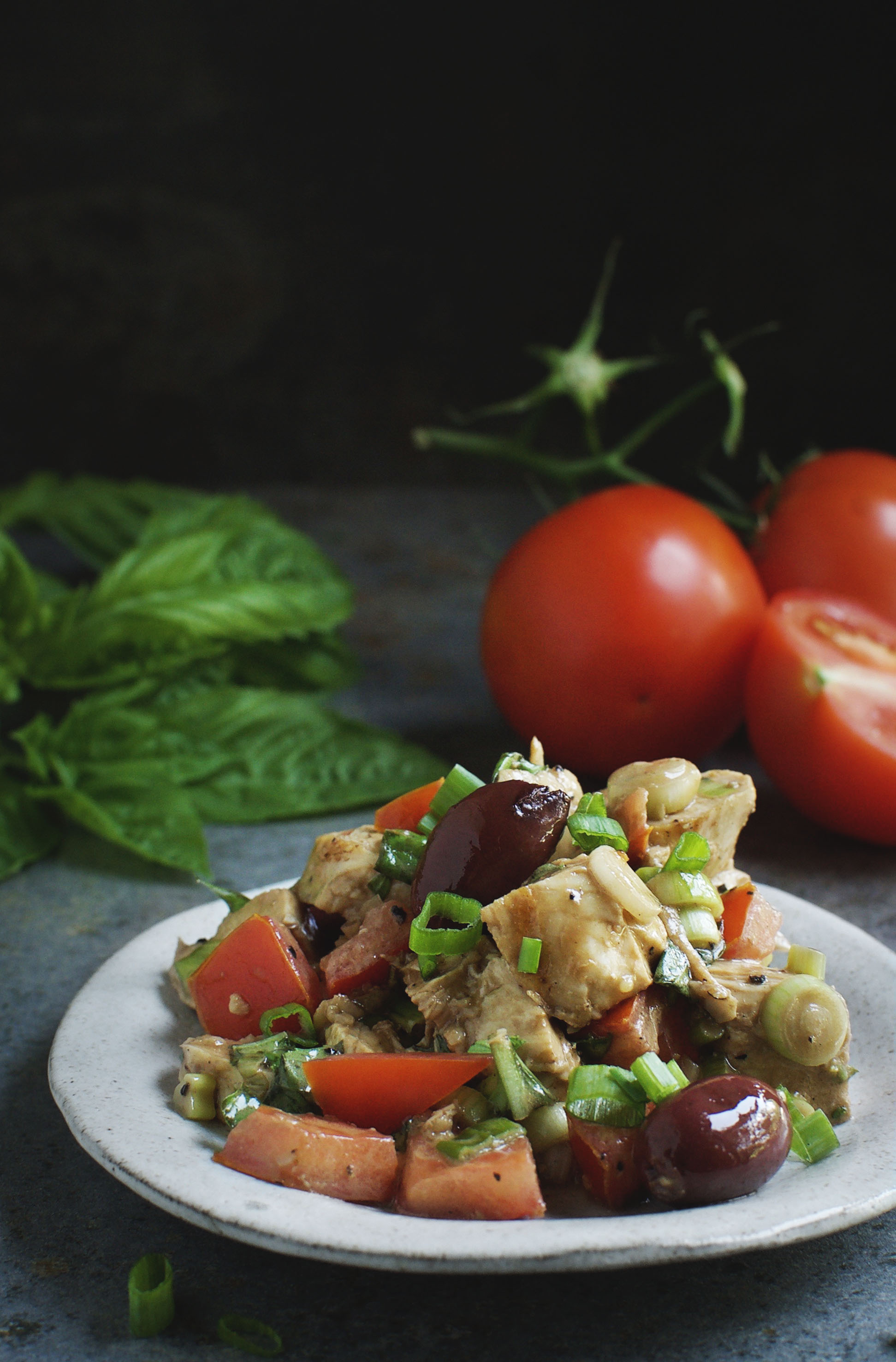 I made very few changes to the dressing for the salad. The base of the dressing is olive oil and balsamic vinegar with a touch of garlic. It contains just enough mayonnaise to add a bit of creaminess and just enough sweetener to balance the acid in the vinegar. This dressing works well with the chicken, basil, tomatoes, black olives, and green onions.