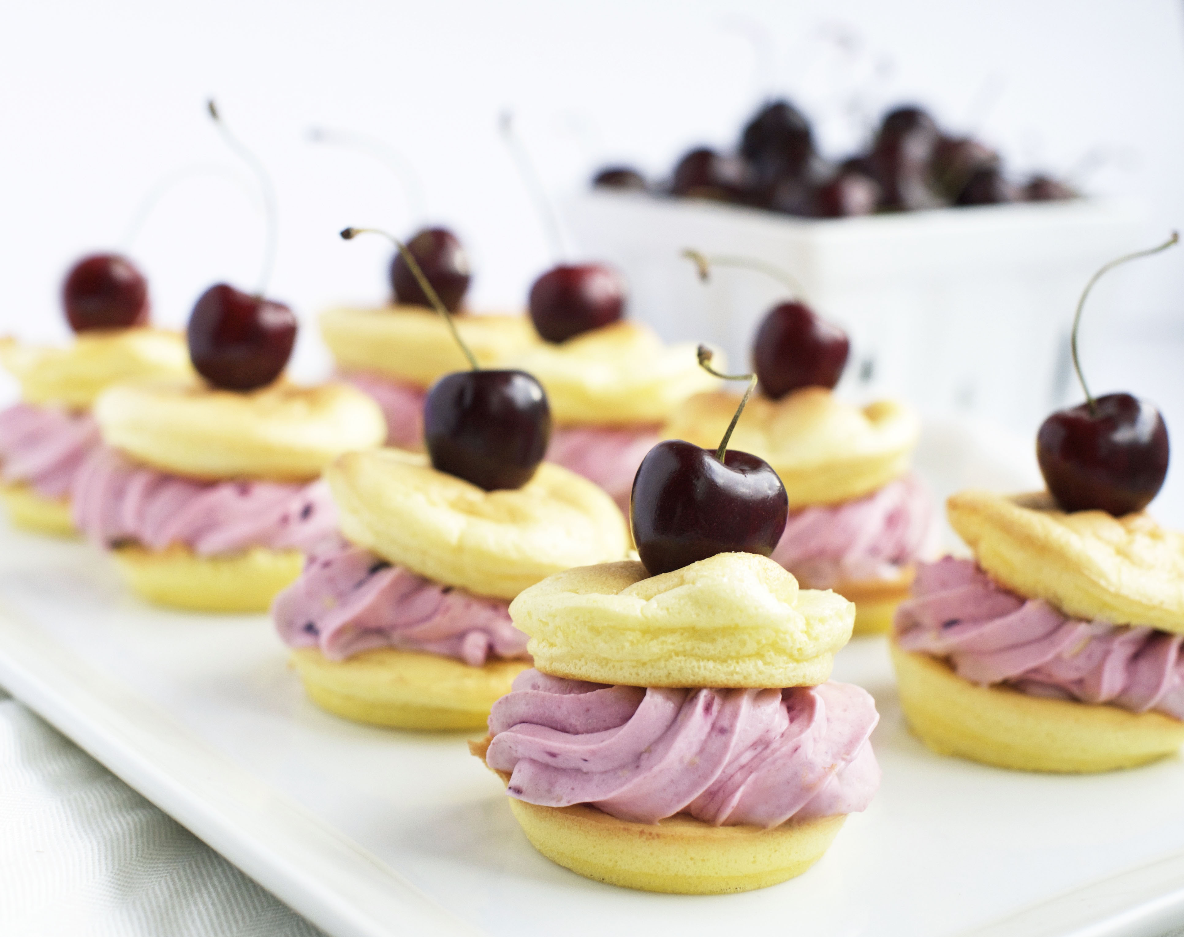 4. Once the profiterole rolls have cooled, use a pastry bag to pipe the cherry cream onto 12 of the flatter rolls.