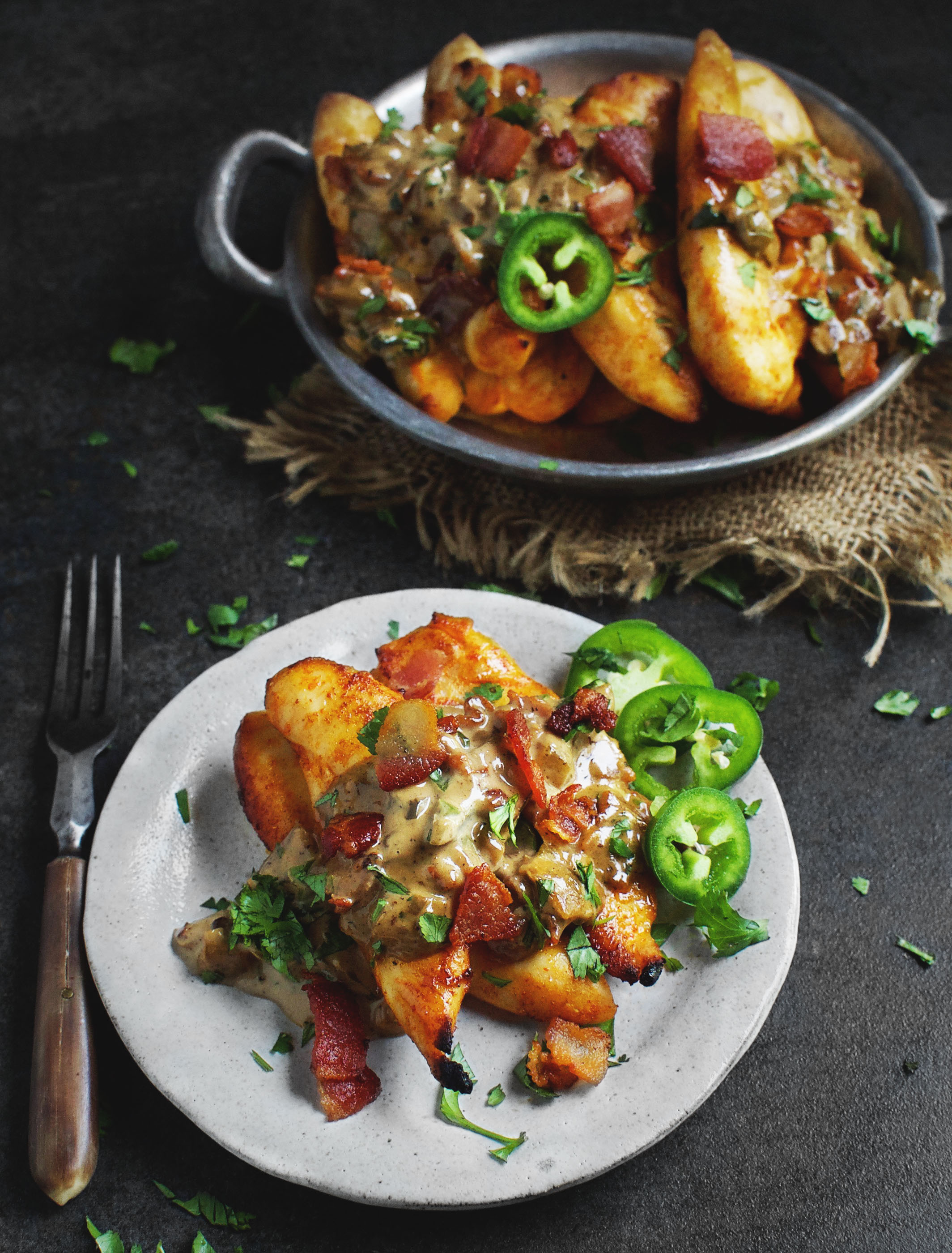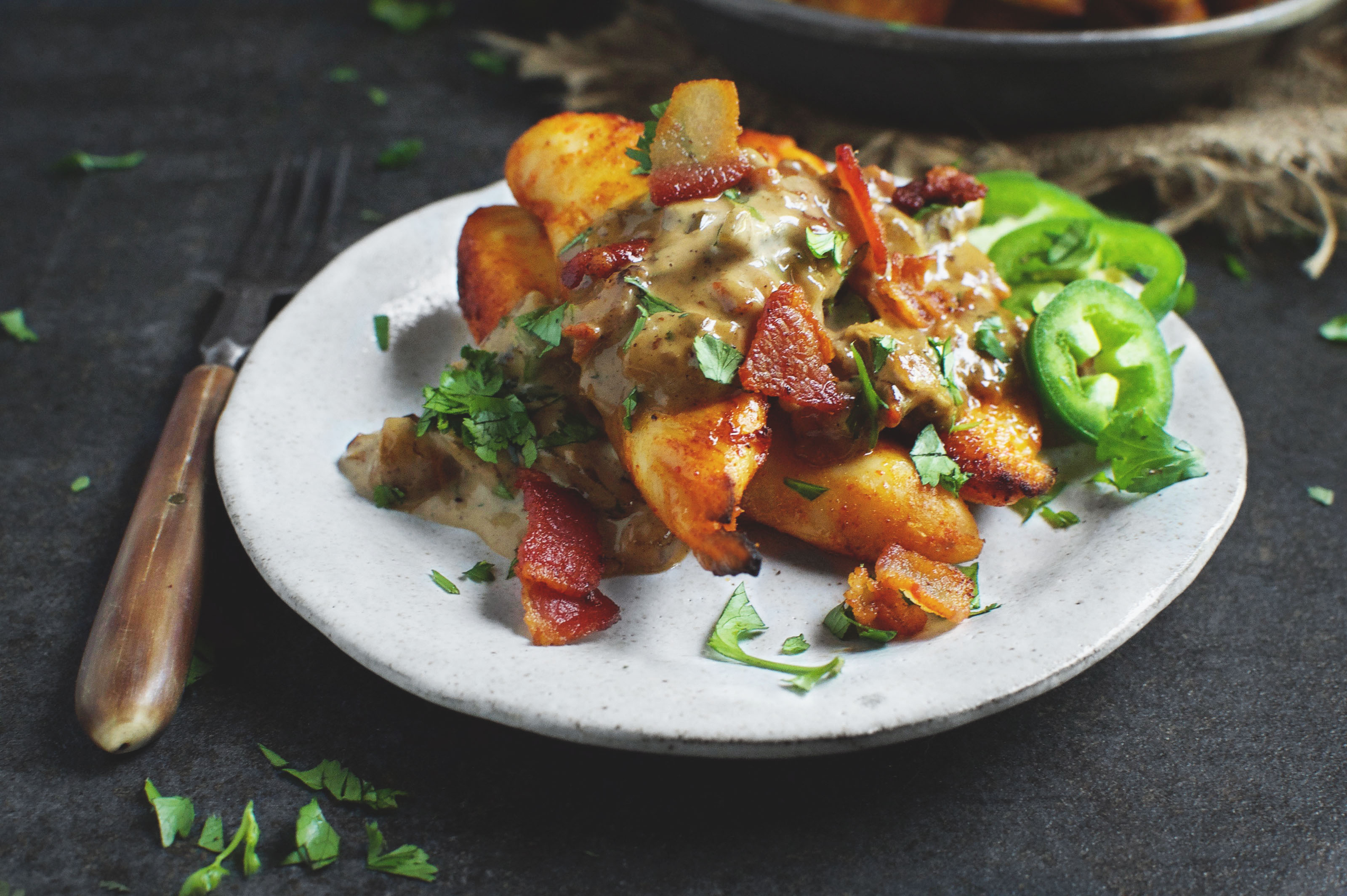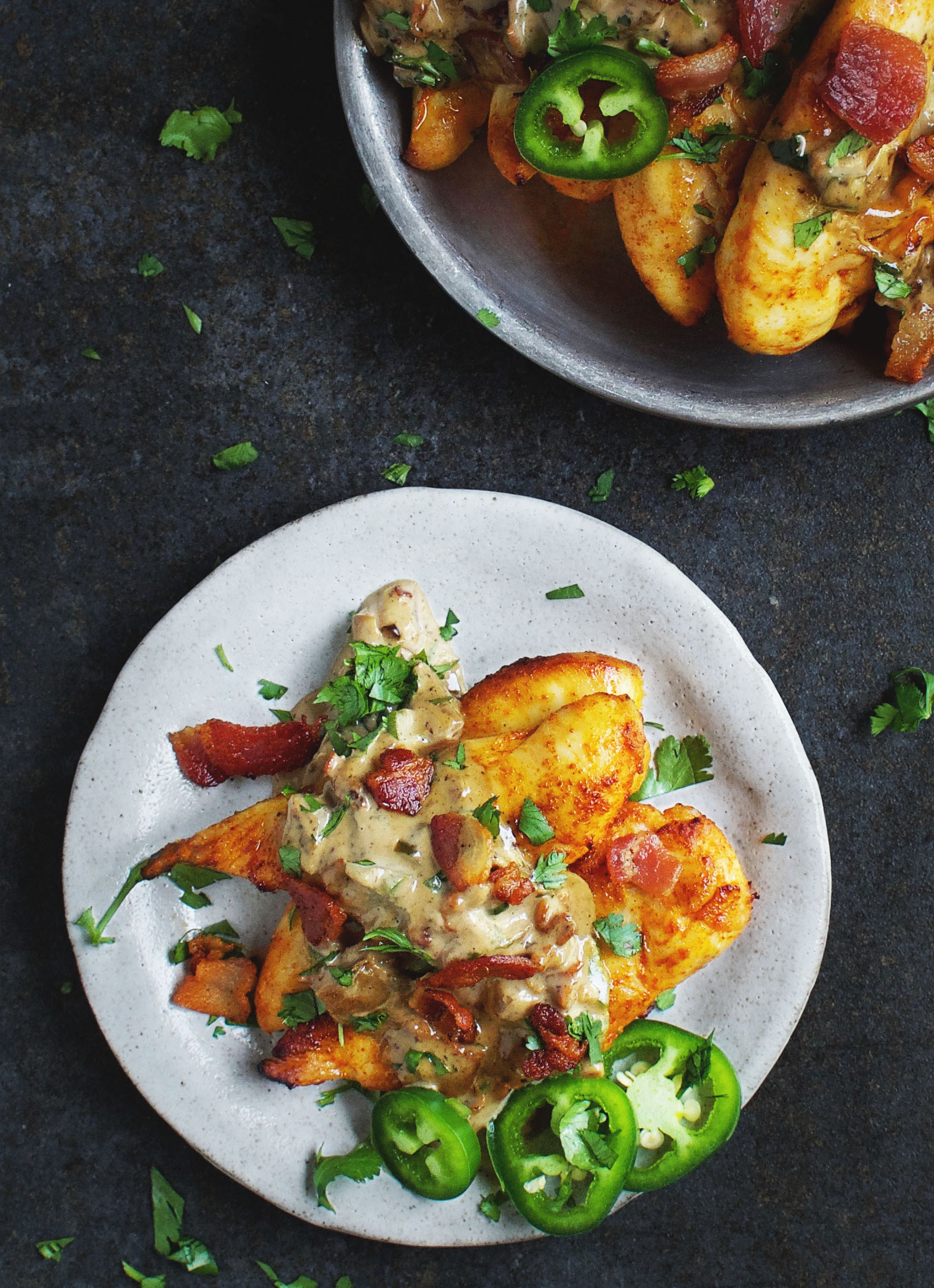 Bring cream to a simmer. Simmer, stirring occasionally, until cream has thickened to desired consistency. Stir in the remaining jalapeño, the cilantro or parsley, and the bacon pieces. Taste and adjust seasoning with salt and pepper, if desired.