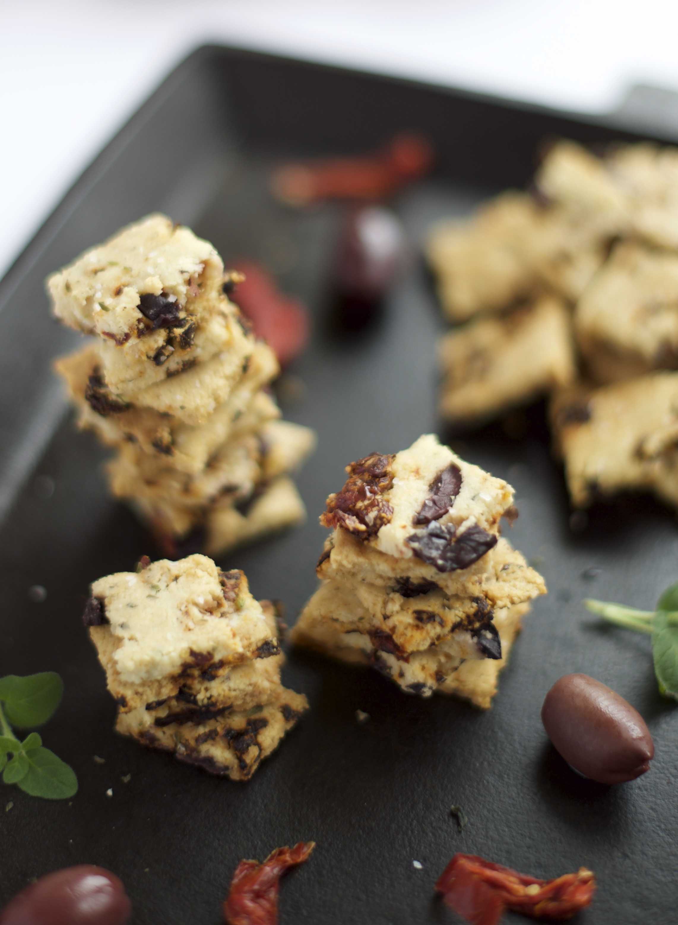 Ever since I first made grain-free crackers, I have been dying to try them with sun-dried tomatoes and black olives. To be honest, I’m actually not a huge fan of raw tomatoes. I’m definitely one of those people that would push the tomatoes to edge of the plate when they come with a salad, but sun-dried tomatoes are a completely different story for me. Sun dried tomatoes have a wonderful savory flavor that would be hard to replicate. I love the distinct flavor sun-dried tomatoes add to any dish. Paired with olives, they perfectly complement each other; creating a heavenly mixture of savory saltiness.