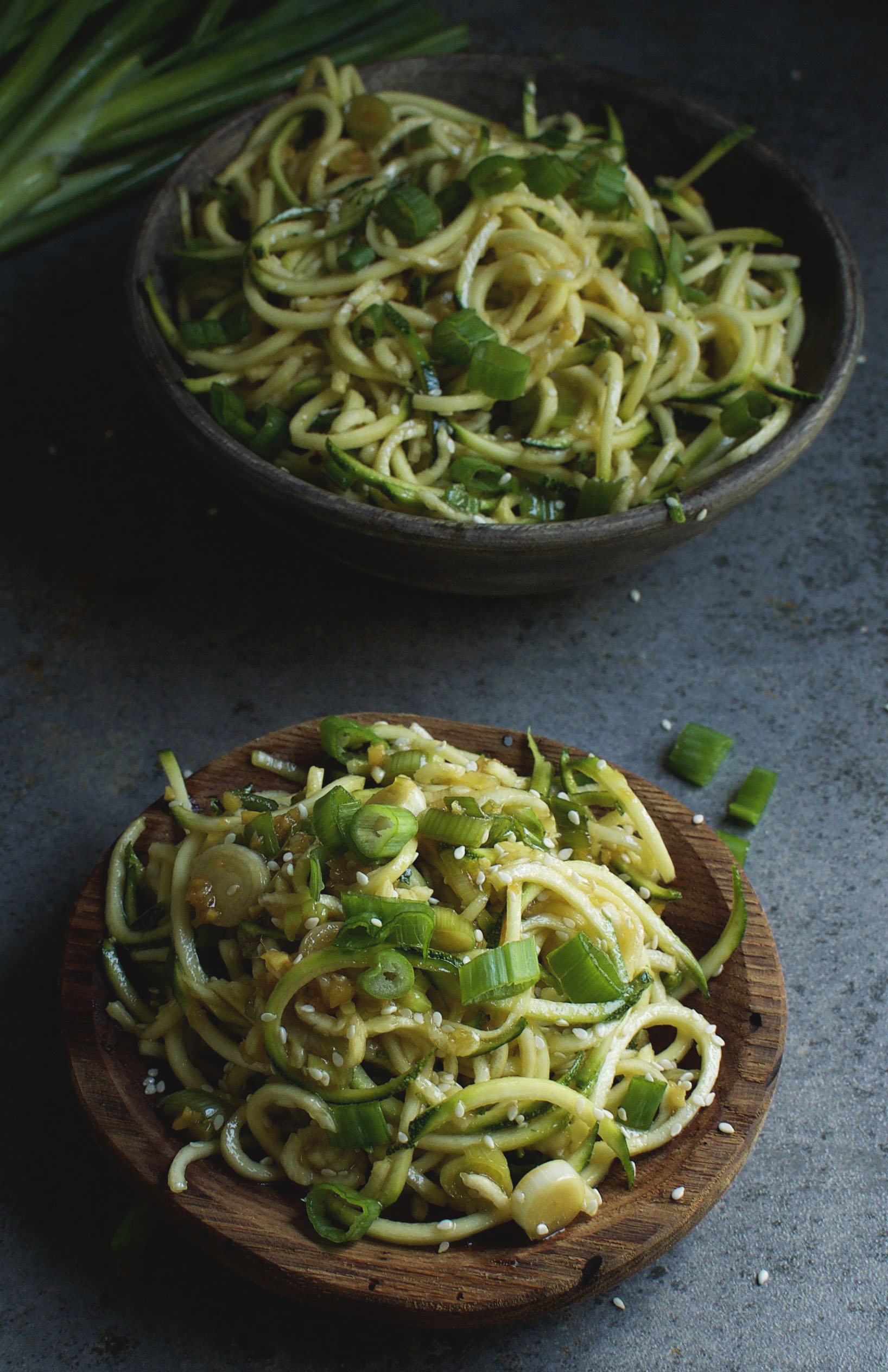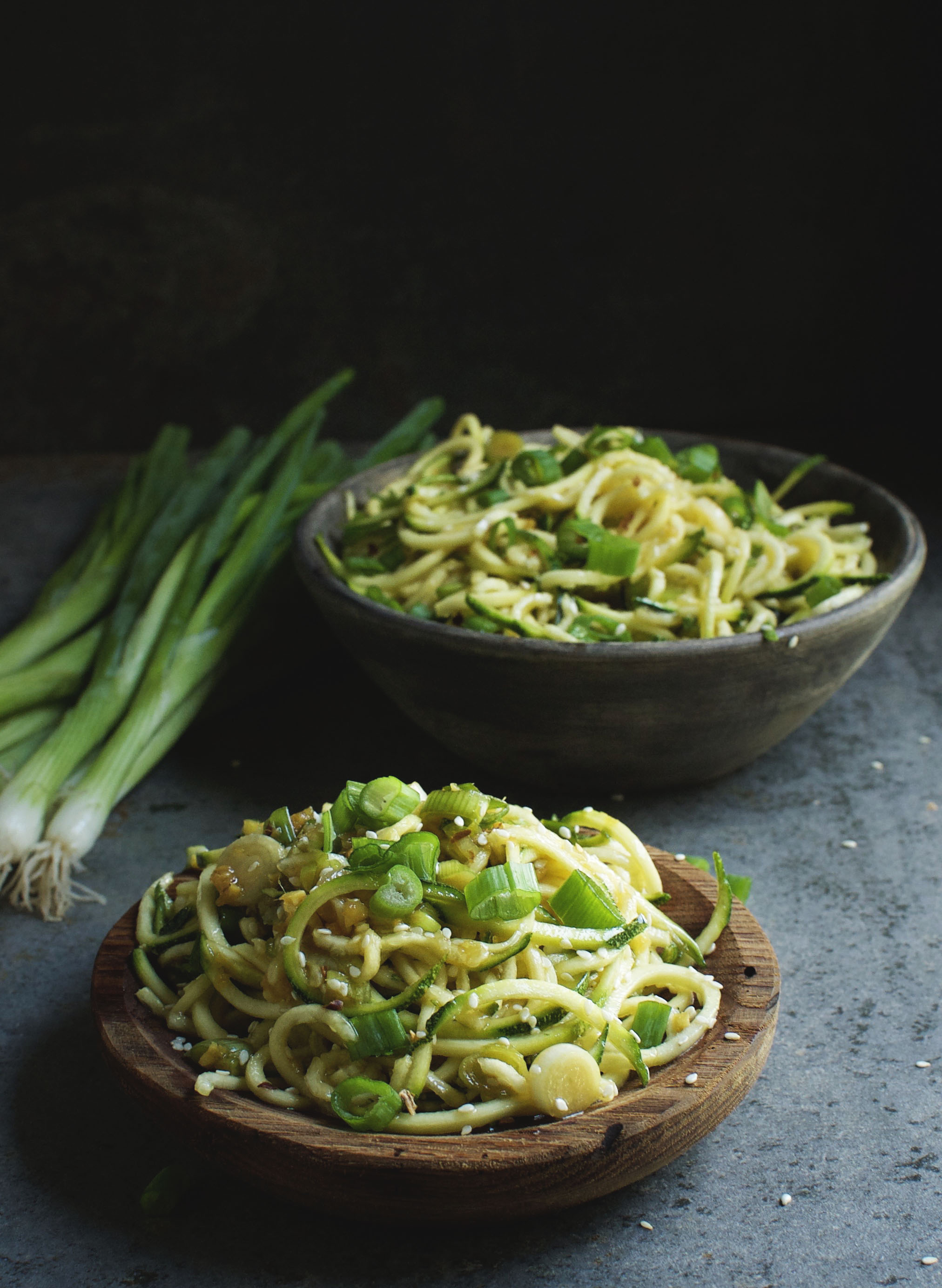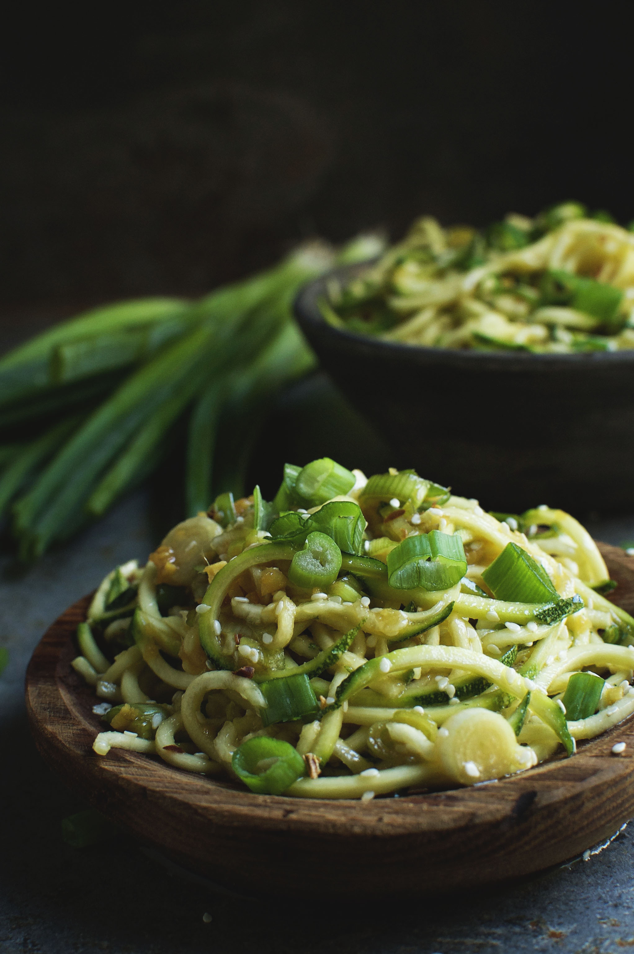 The tamari works well with toasted sesame oil, fresh ginger, rice wine vinegar, red pepper flakes, and scallions. The zucchini noodles soak up all of this good flavor and add a satisfying crunch.