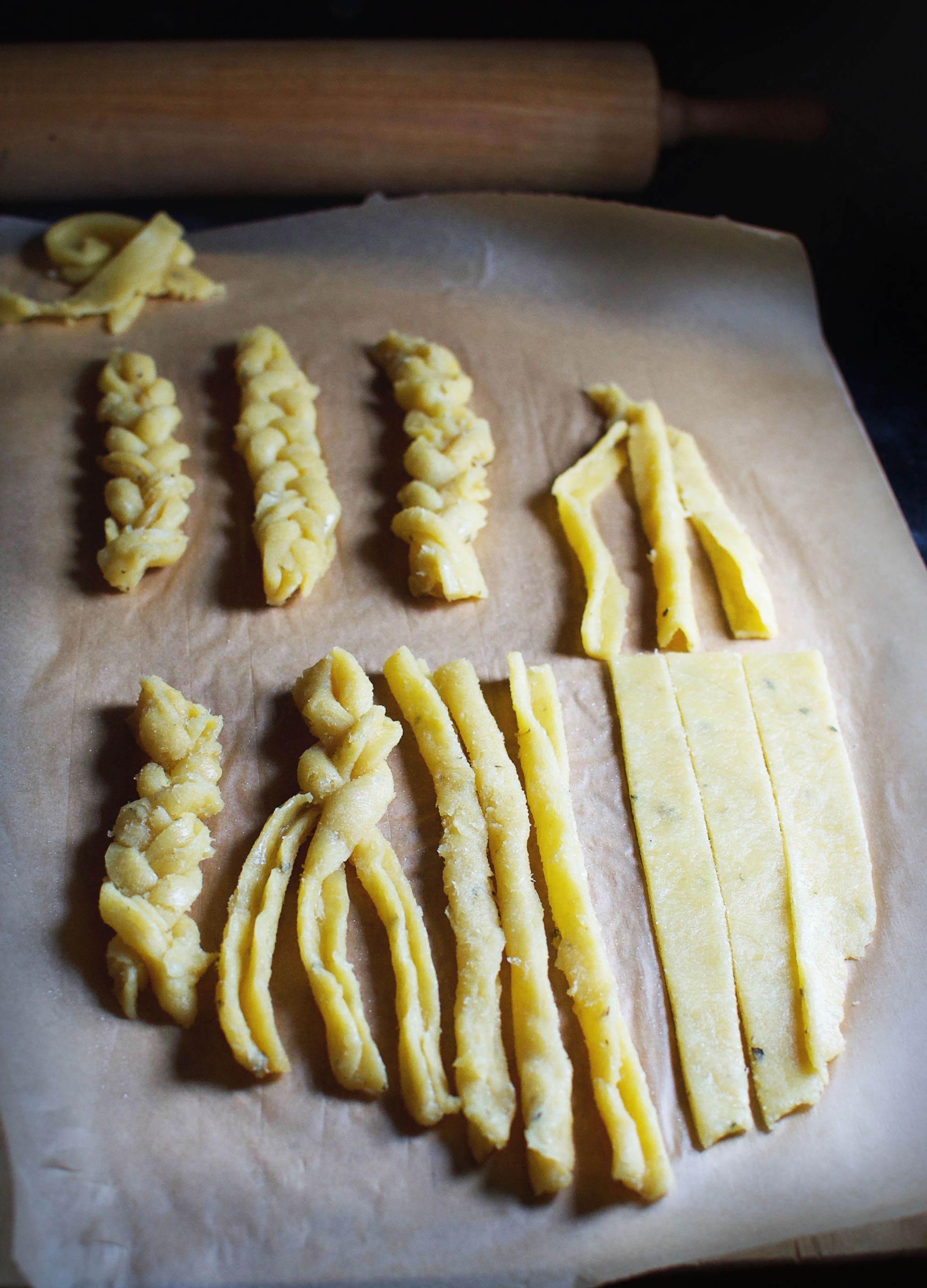 - Slide the parchment containing the dough onto a cutting board. Using a serrated knife or a pizza cutter, trim off the most ragged edges. Cut the dough lengthwise in four equal pieces, then cut each of the four pieces into 3 strips. This should form 12 long strips. Cut these strips in half to form 24 shorter strips. Working with three strips at a time, fold the strips in half and pinch together, then pinch the ends of the three strips together at one end. Braid the three strips and pinch together at the other end.
