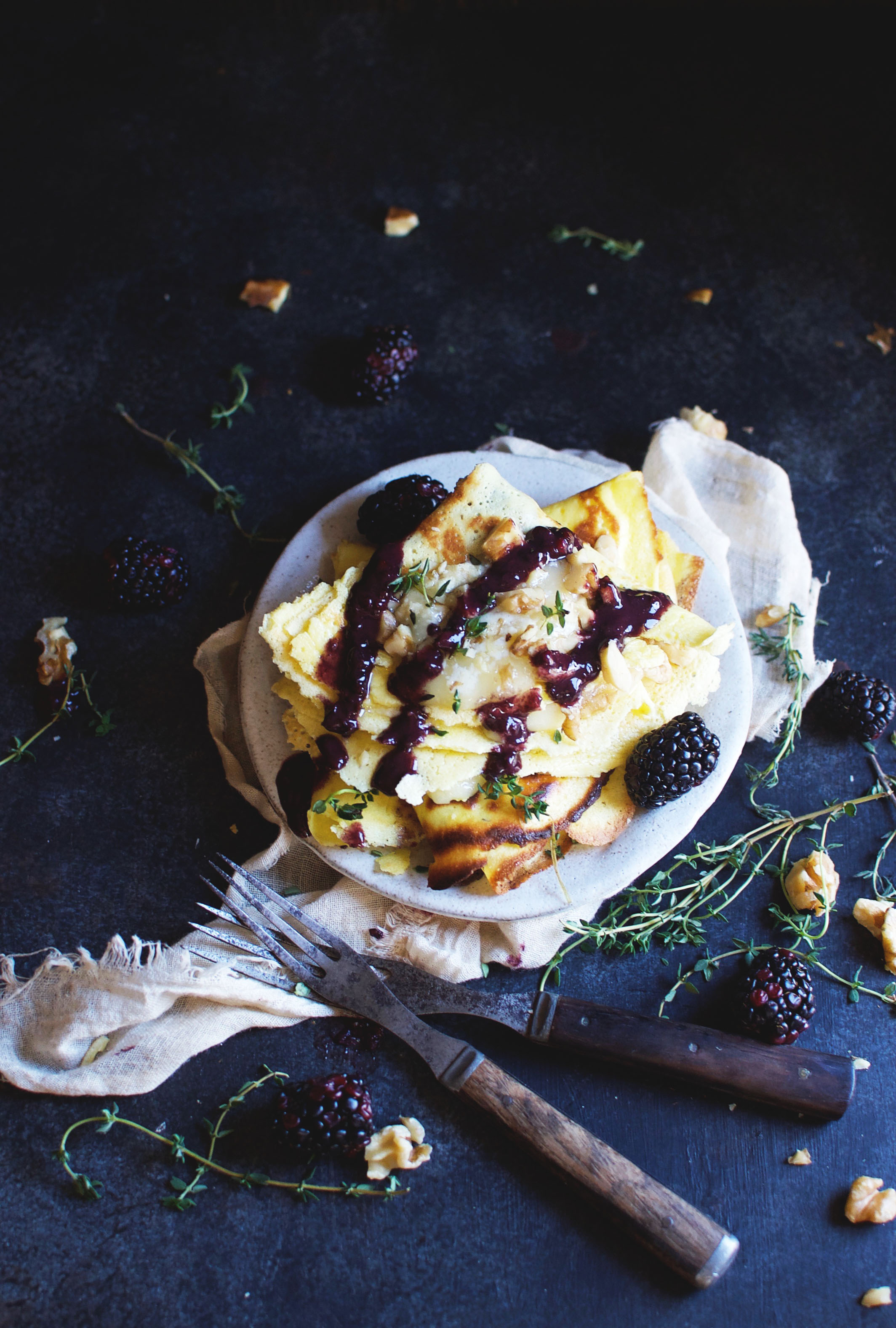 Imagine melty brie cheese tucked in a delicate crepe, trickled with savory blackberry sauce and sprinkled with walnuts. Crepes with light, crispy edges and a hint of thyme make the base for this recipe. Slices of buttery brie, a sprinkle of walnuts, and a drizzle of blackberry sauce are folded together and melted into gooey deliciousness. The blackberry sauce has a wine reduction base, enhanced with garlic and fresh thyme, and finished with a bit of butter. The sauce adds sweet, tart, and herbaceous interest to the brie. Walnuts work perfectly with the brie and add a bit of crunch and nutty flavor to the mix. The end result is melted cheese goodness with a zing.