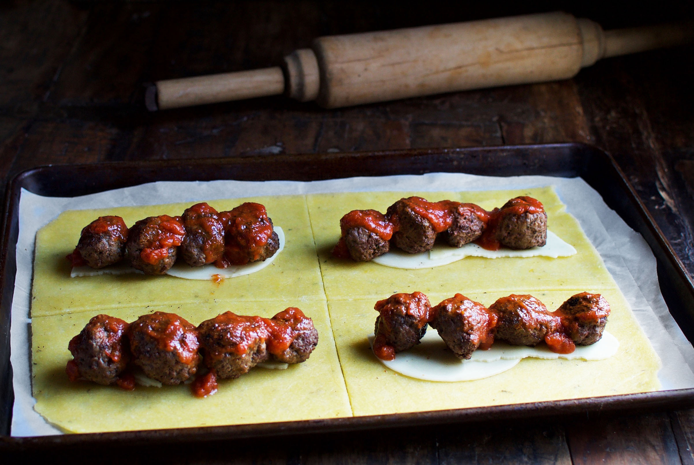 Slide the parchment containing the dough onto a cookie sheet. On each section, place two halves of the provolone cheese, then arrange 4 meatballs lengthwise over top. Spoon one tablespoon of spaghetti sauce over the the 4 meatballs on each rectangle.