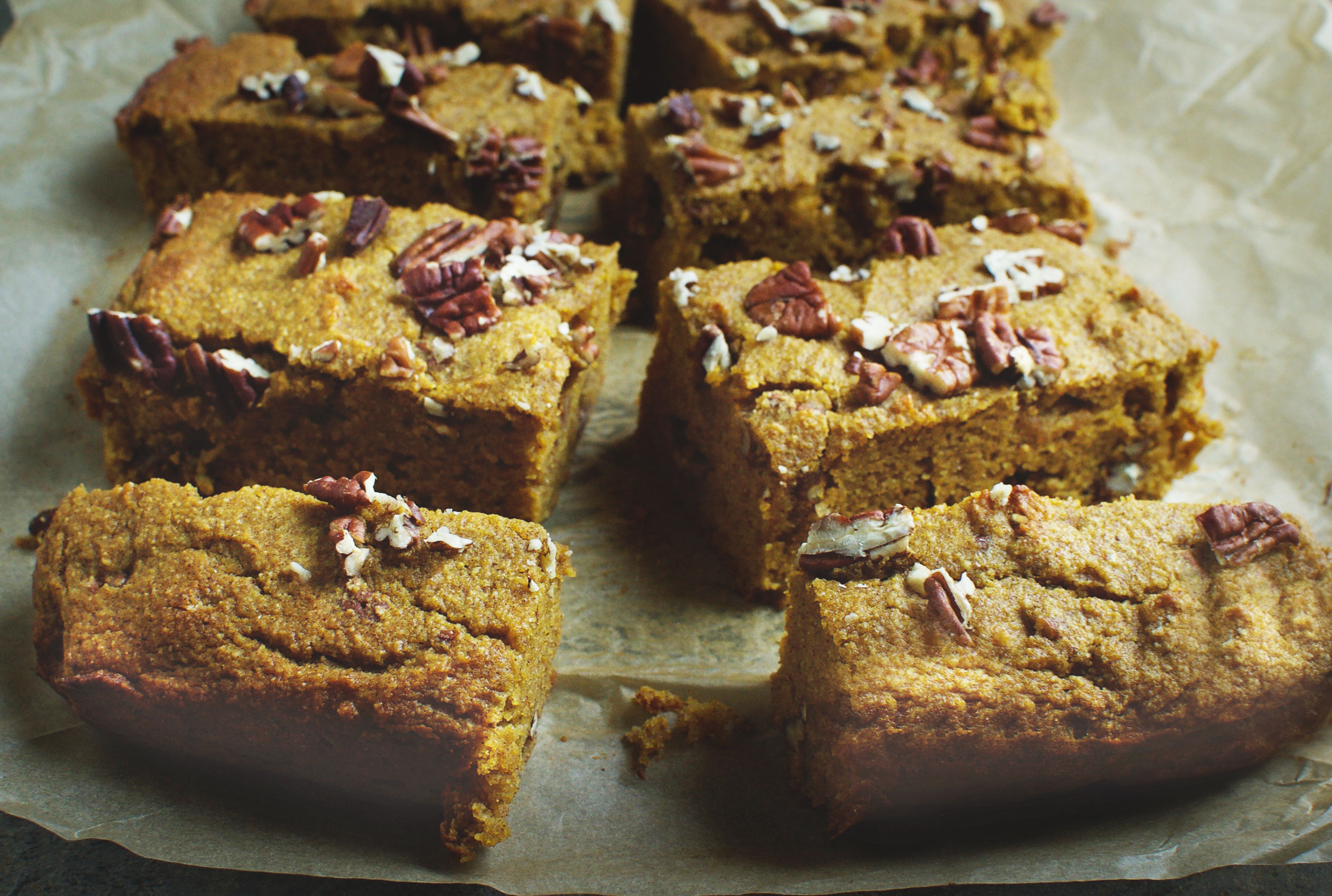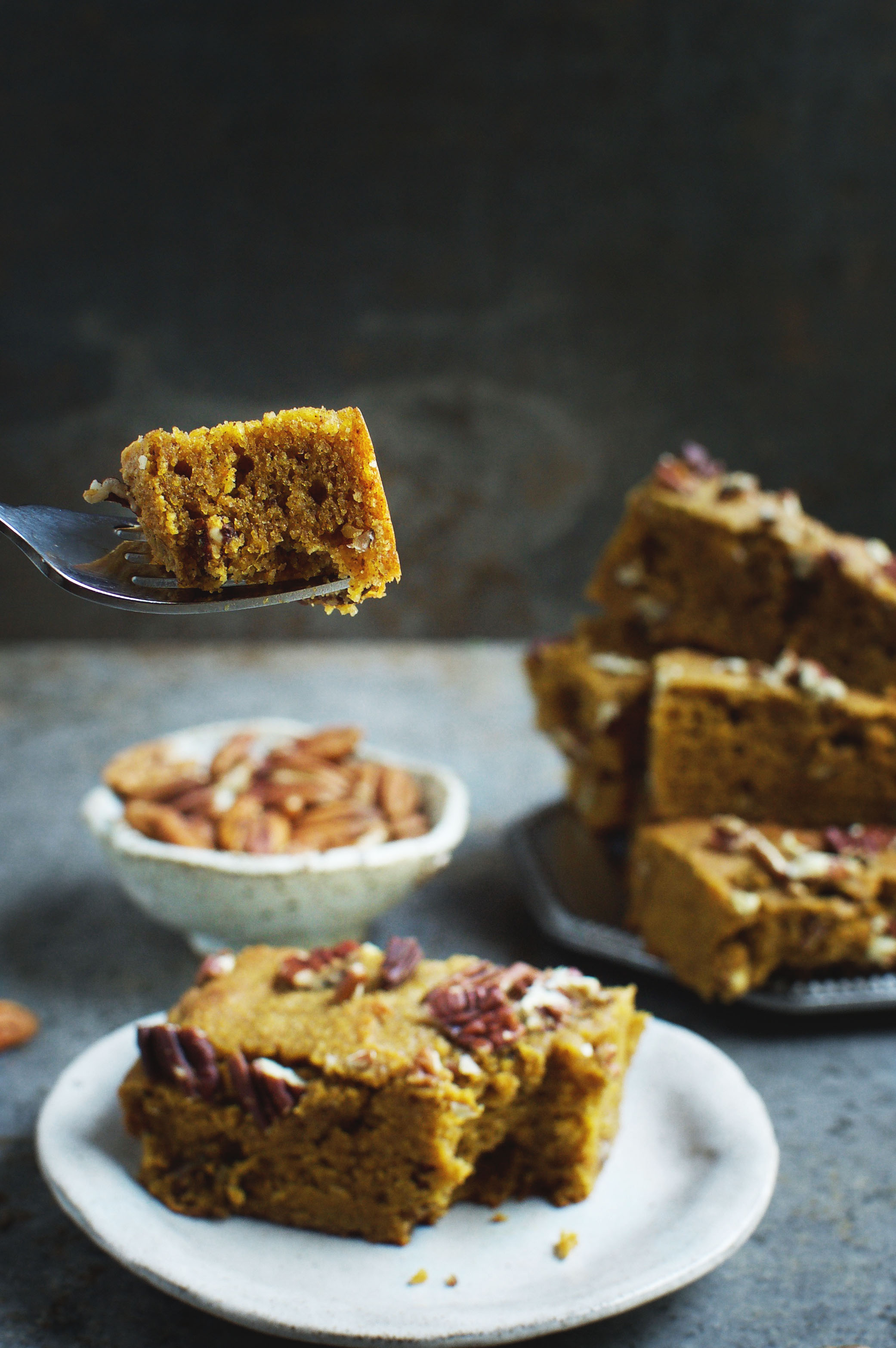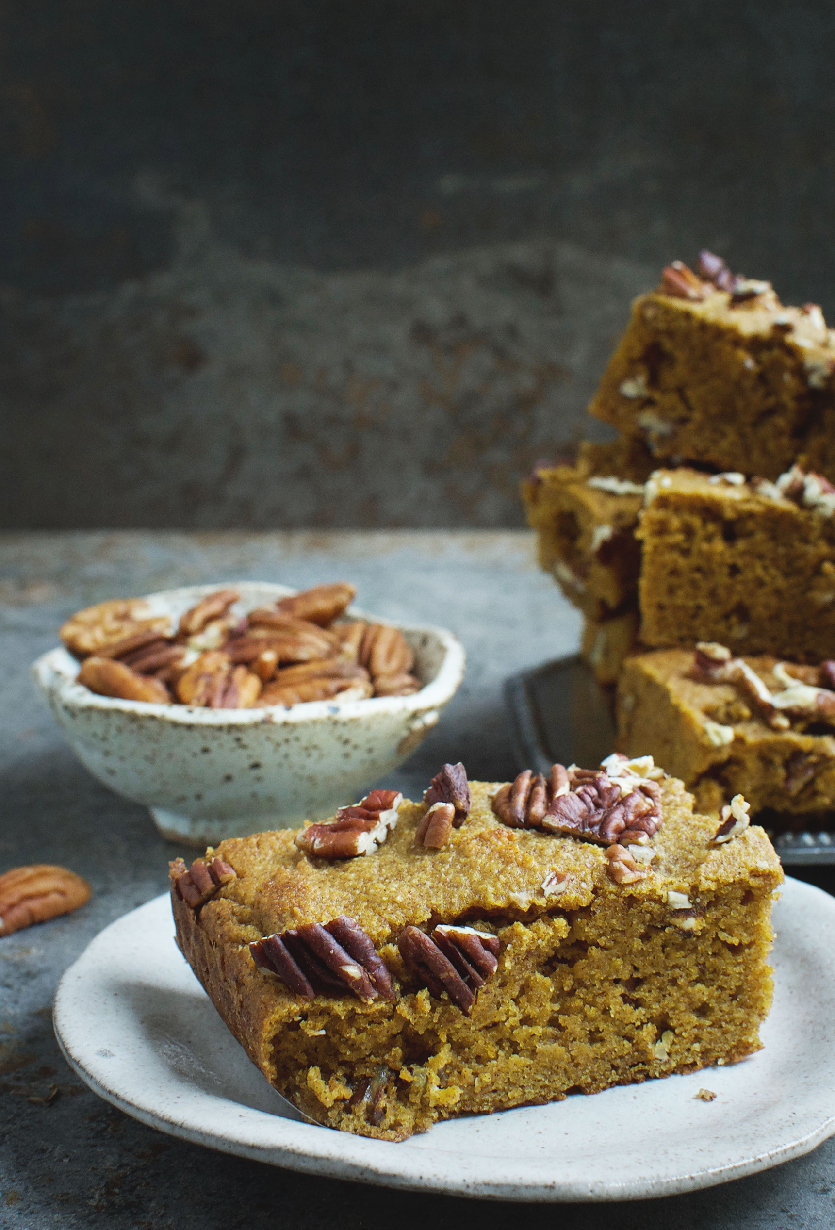 I always keep a can of pumpkin puree in the cabinet this time of year for pumpkin craving emergencies. So I grabbed the can and put it to good use. This recipe came together so perfectly it was like pieces of a puzzle. The last piece of the puzzle was the addition of chopped pecans, both in the batter and on top of the bars. In the oven they went and as they baked they filled the house with pumpkin spice goodness.