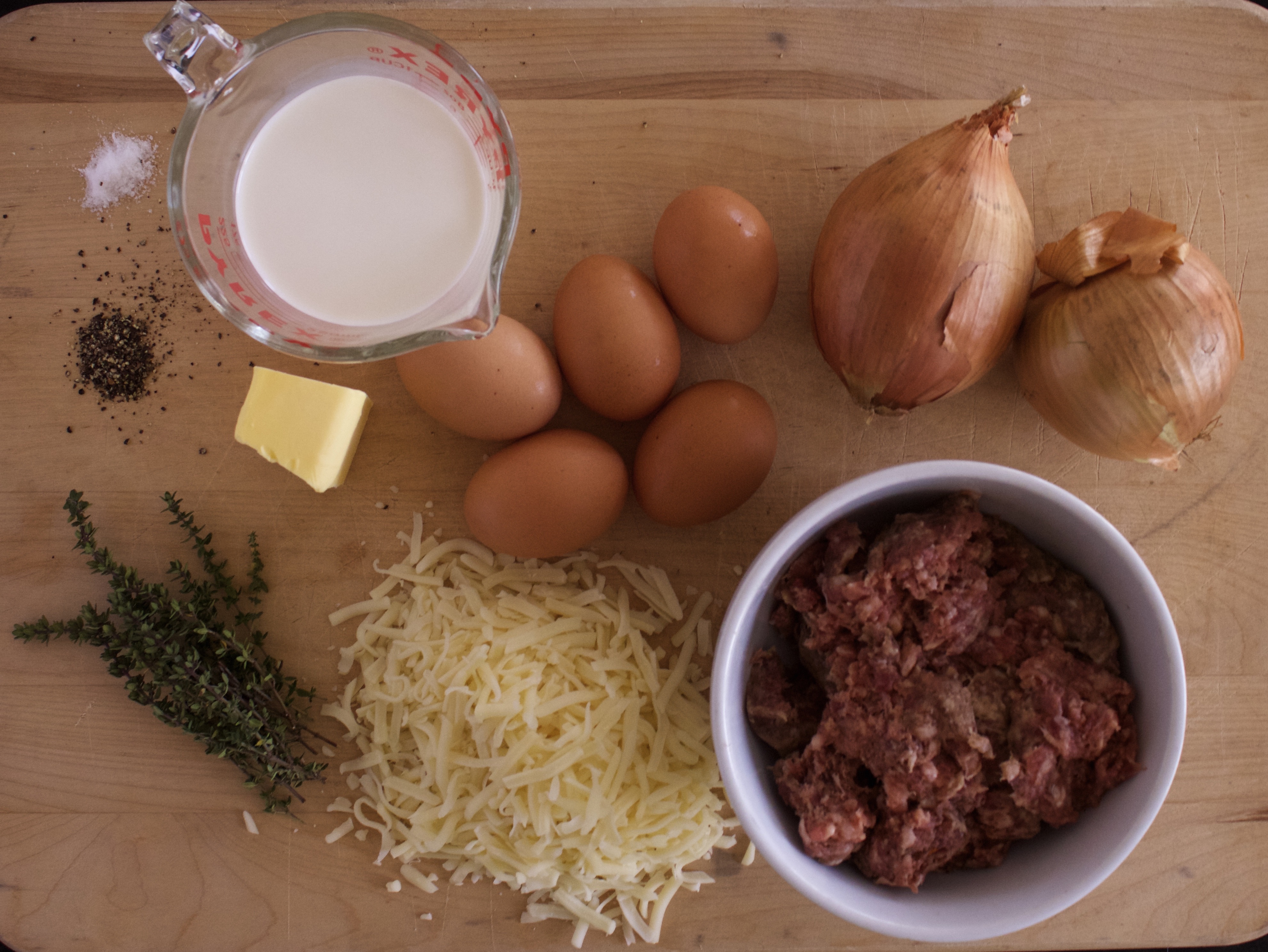 Photo of ingredients for low carb sausage, caramelized onion, and gruyere pieSome may be surprised that I have sausage in one of my recipes.  Many people think of pork as an unhealthy meat.  Really, it depends how it is raised.  I use local, organic, pasture-raised pork.  The pasture environment infuses the pork with omega-3 fatty acids making the meat much healthier than the stuff raised in commercial facilities.  Check out your local farmer’s markets for organic pastured meat.