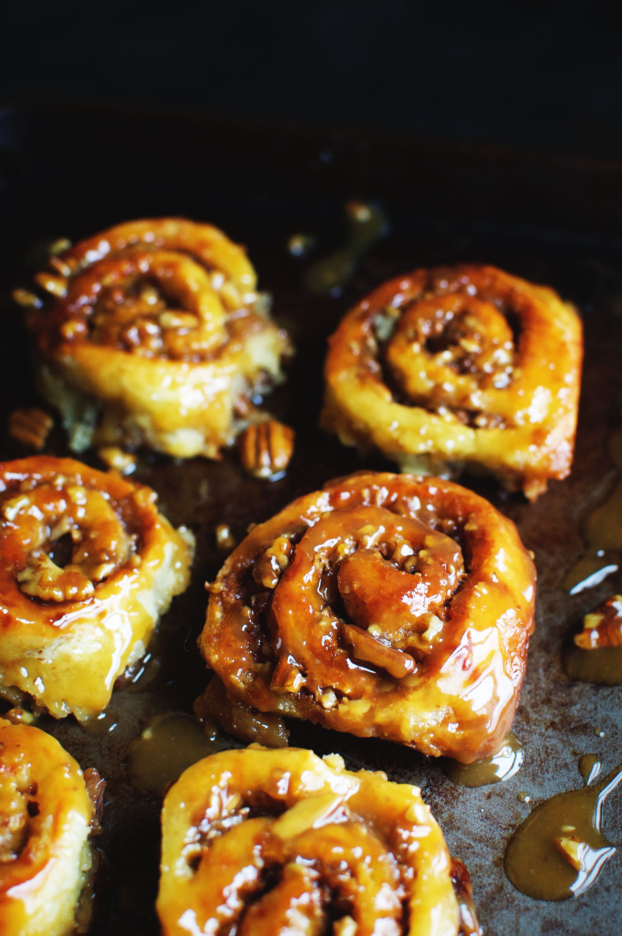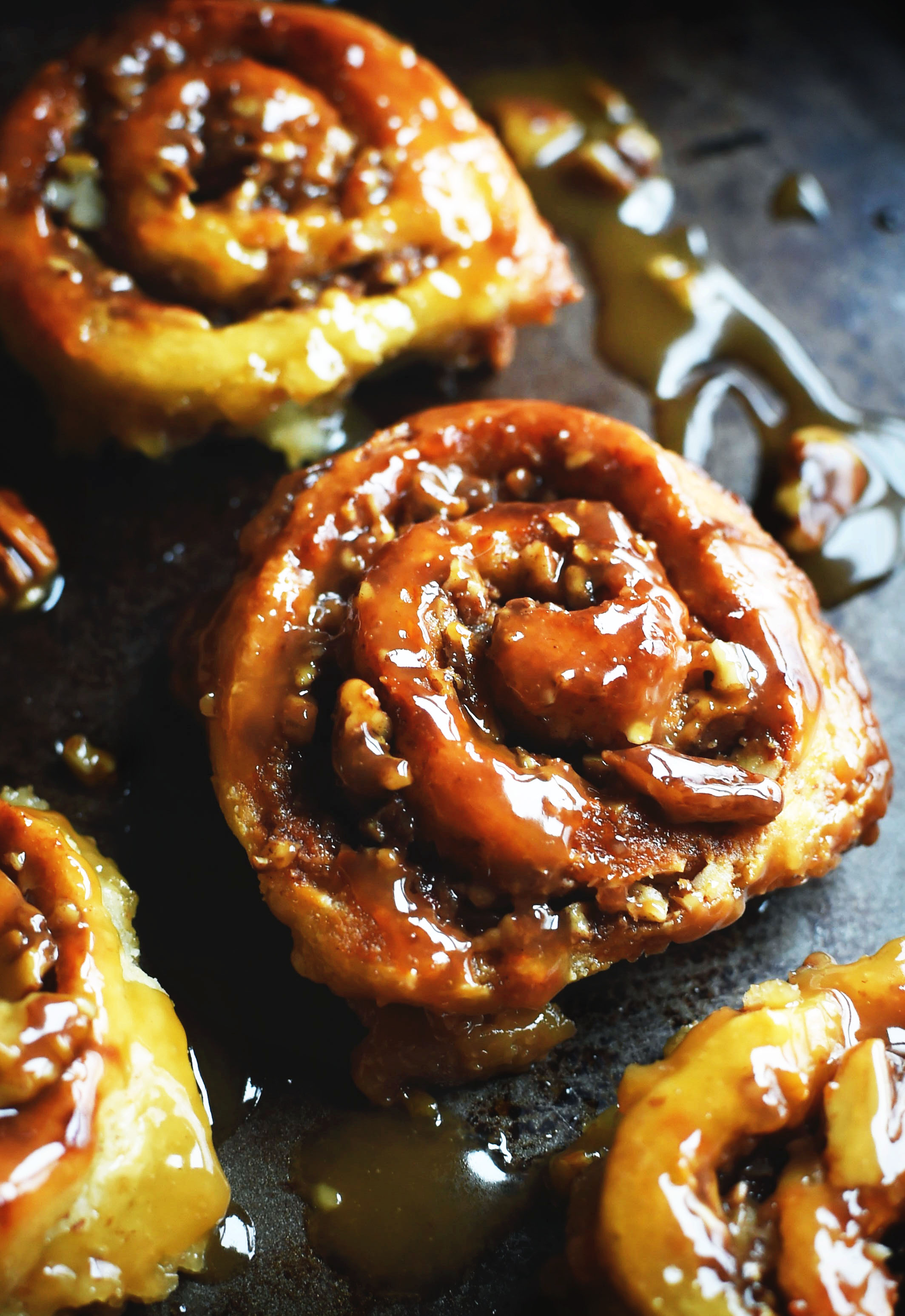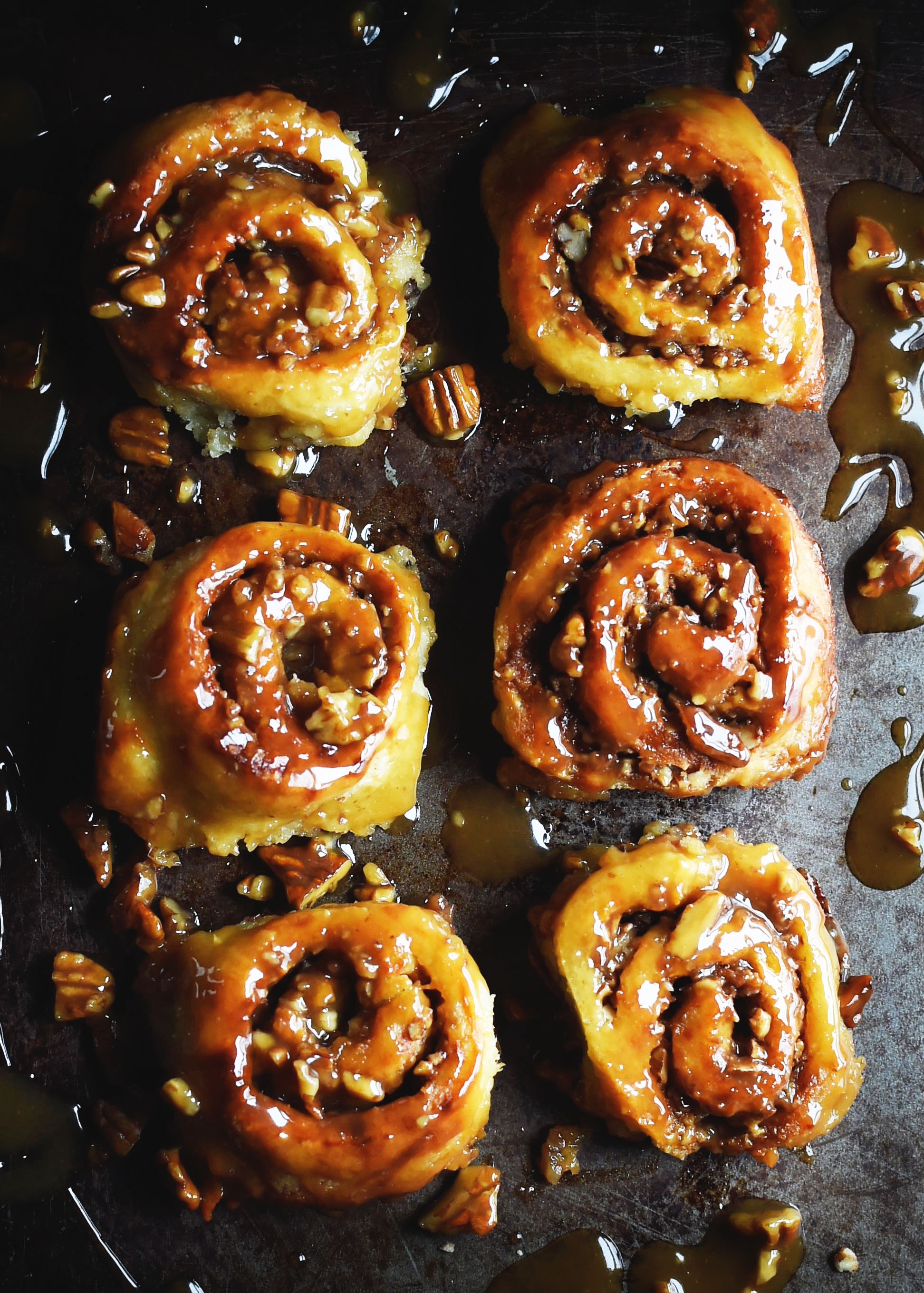 - Allow to cool for 5 minutes, then cover the pan with a large plate and flip, so the rolls come out onto the plate with the caramel and nuts that were in the bottom of the pan on the top of the rolls. Serve warm.